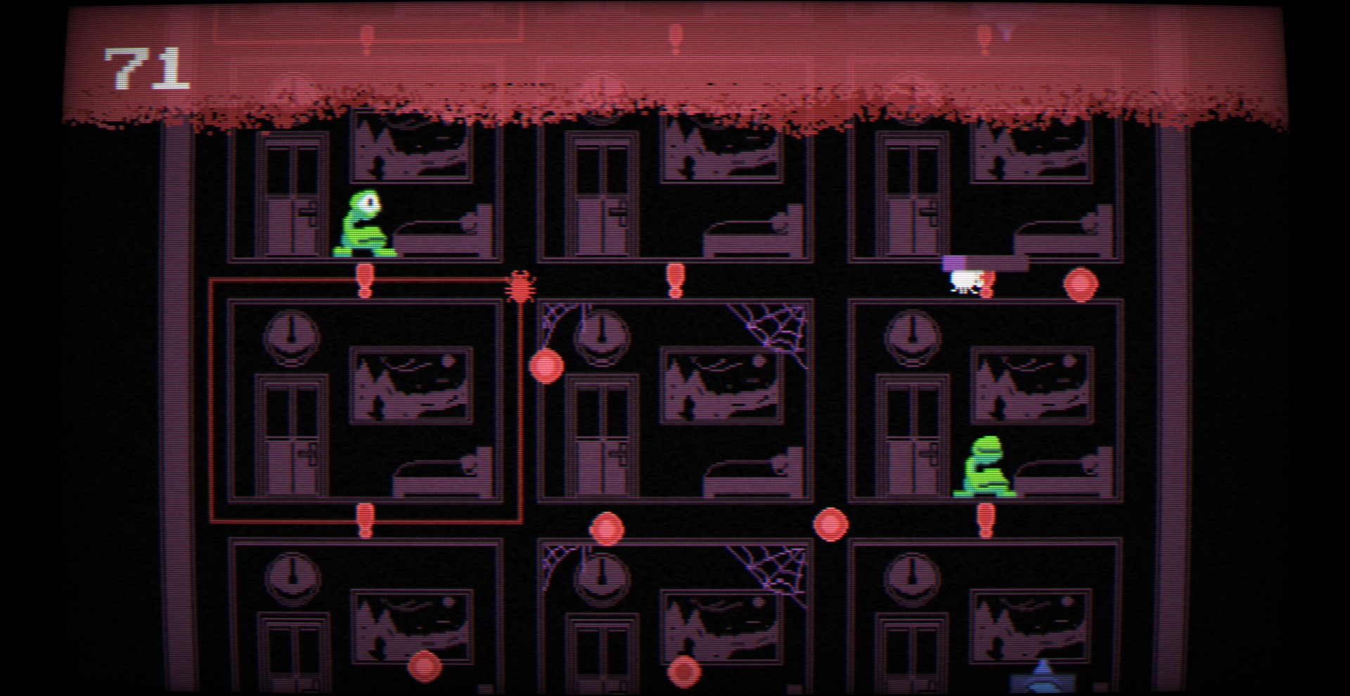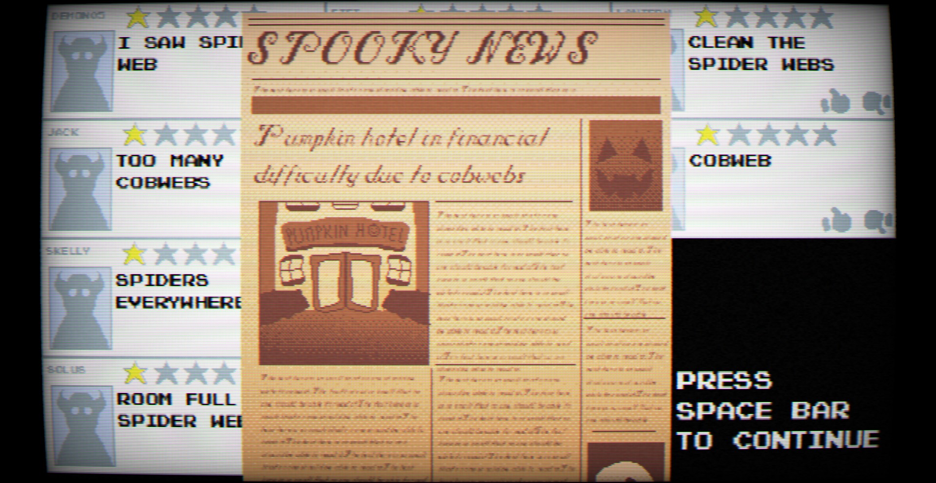A small spider has been spotted in the Pumpkin hotel ! And if the clients find cobwebs in their room, it will tarnish the reputation of the hotel ! But you are that spider. Weave as much web as you can in the rooms of the hotel and see the consequences of your actions on the hotel's reputation.